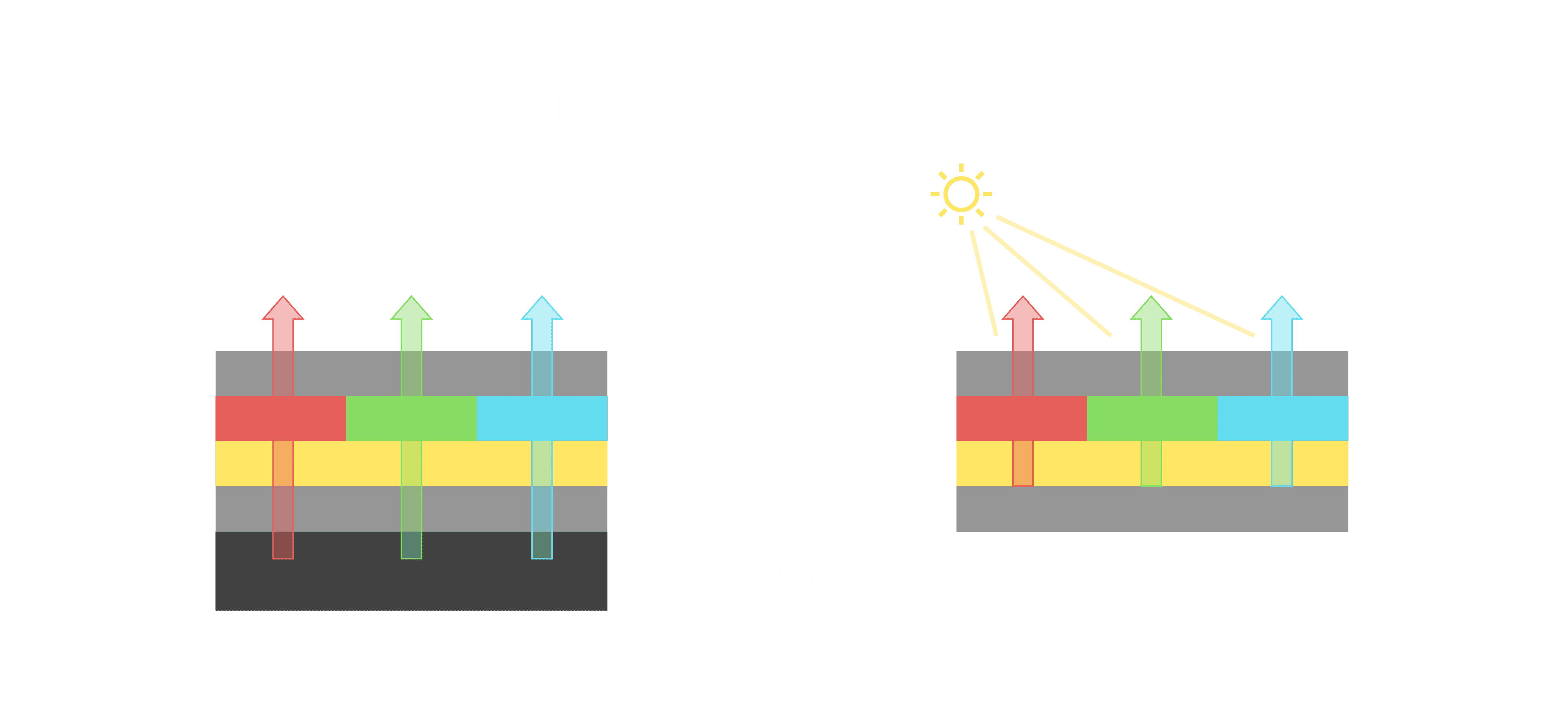 与传统需搭配背光单元的液晶显示相比,,,,反射式液晶技术不仅更省电、、、更轻薄,,且即便在艳阳下仍能清晰显示。。。此外,,,,少了背光单元,,也大幅降低了 LED 蓝光伤害眼睛的疑虑。。。。