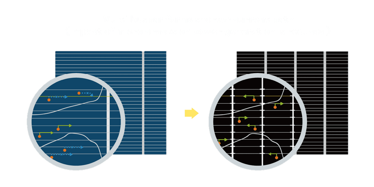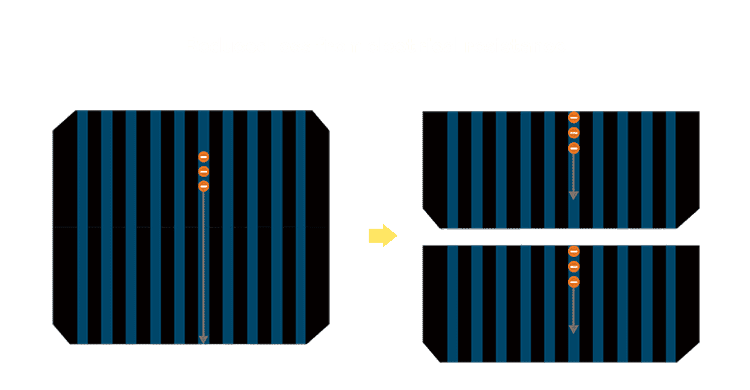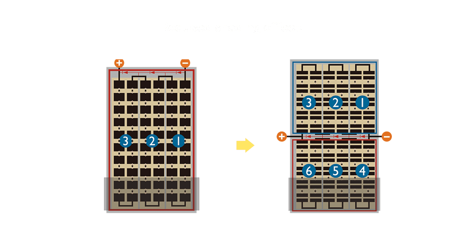 - 结合半切电池,,,降低遮阴影响、、、、提升模组抗隐裂能力、、、并减少电阻损耗,,,进一步提升模组发电效能。。。